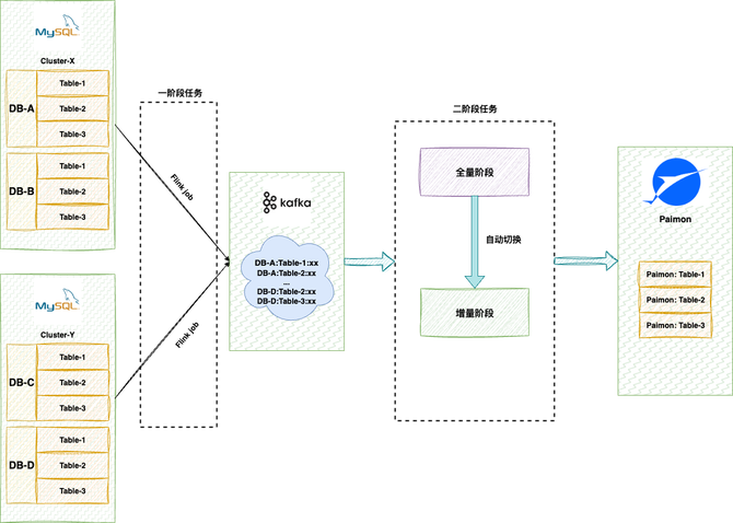 第一阶段(source 任务):由平台统一管理的共享 Flink 作业。该任务负责从指定 MySQL 实例读取 binlog,并将增量数据分发至 Kafka。此任务对普通用户透明且不可操作,确保了对核心 DB 资源的合规、高效复用。