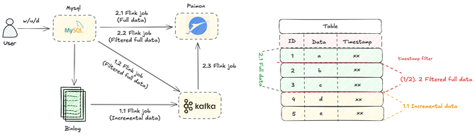 解法:我们开发了带有时间戳过滤的全增量一体的补数方案, 如图 5 所示。用户可以通过配置,可以进行一键补数。其核心是带有时间戳过滤的全增量一体同步。但是这个方案存在一个局限:就是会导致 MySQL 一些被删除的数据无法同步到 Paimon 中删除。即在异常期间,源端数据库已删除的数据,其删除操作未能同步到 Paimon,导致这些数据在 Paimon 中仍然存在。