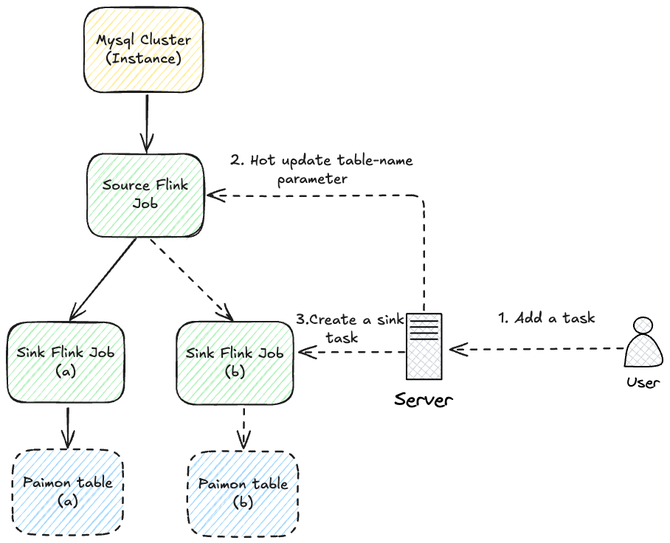 挑战:当链路稳定运行之后,为实现平台化,我们面临一个问题:每当有新用户需要同步新表时,都必须重启共享的 Source 任务,这会引发下游所有消费任务的抖动。最初,我们尝试同步一个 database 下的所有表,但很快发现这会向 Kafka 写入大量非必要数据,且非目标表的批量操作(业务如凌晨刷数、归档等)会导致 binlog 暴增。