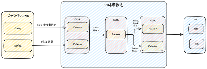 我们采用 Flink CDC+Paimon+Trino/Spark 作为小时级数仓的技术底座,通过流式入湖和小时级调度,形成了从多源异构数据采集、分钟级入湖、分层存储管理到最终应用服务输出的全链路技术架构。